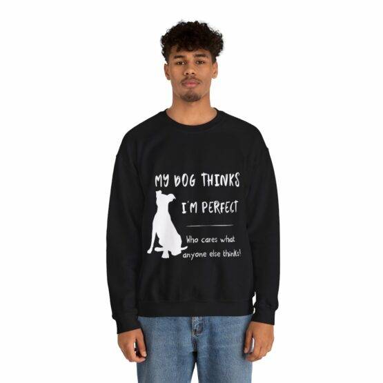 Sweat unissexo sem capuz com um toque de humor para quem adora os nossos amigos de quatro patas, com a frase “My dog thinks I’m perfect”. Feita de malha Jersey de 100% de algodão macio, decote redondo e com uma estampagem de qualidade.