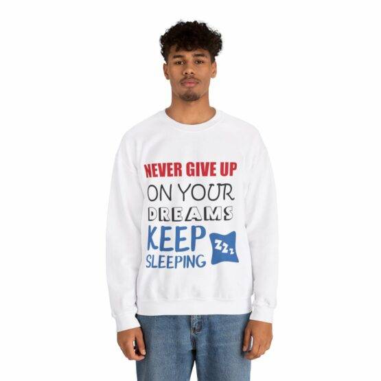 Sweat unissexo branca sem capuz com um toque de humor, ideal para os mais preguiçosos, com a frase “Never give up on your dreams keep sleeping”. Feita de malha Jersey de 100% de algodão macio, decote redondo e com uma estampagem de qualidade.
