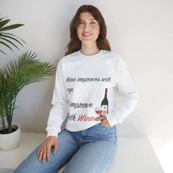 Sweat unissexo sem capuz com um toque de humor com a frase “Wine improves with age I improve with Wine”. Feita de malha Jersey de 100% de algodão macio, decote redondo e com uma estampagem de qualidade.