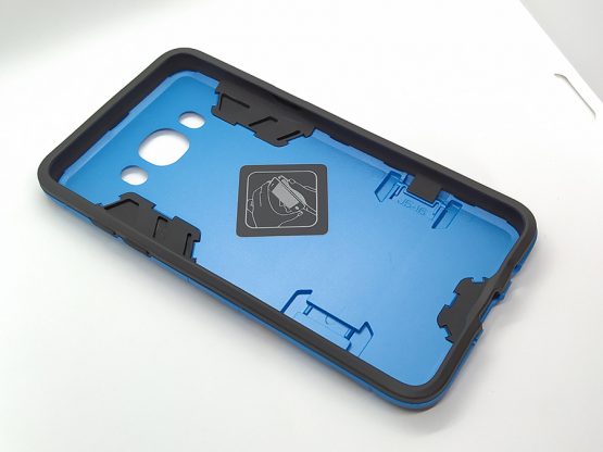 Proteja o seu telemóvel com esta resistente capa anti-choque azul, tem suporte integrado.