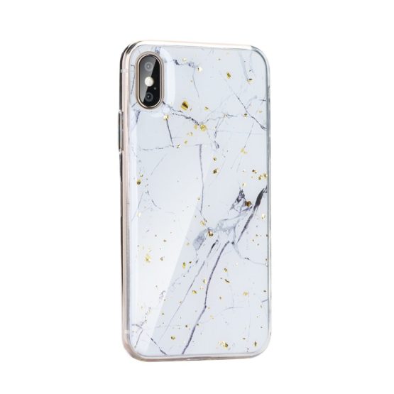 Capa dura e resistente com material de qualidade para proteger o seu smartphone, as bordas são sobressaídas para evitar que o ecrã entre directamente em contacto com superfícies protegendo-o assim de potenciais riscos. Estilo elegante a imitar pedra mármore com a adição de ser abrilhantado com purpurinas no interior da capa.