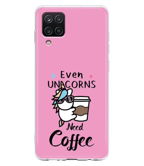Capa de telemóvel em silicone para Samsung A12 “Even unicorns need coffee” de um unicórnio com café.