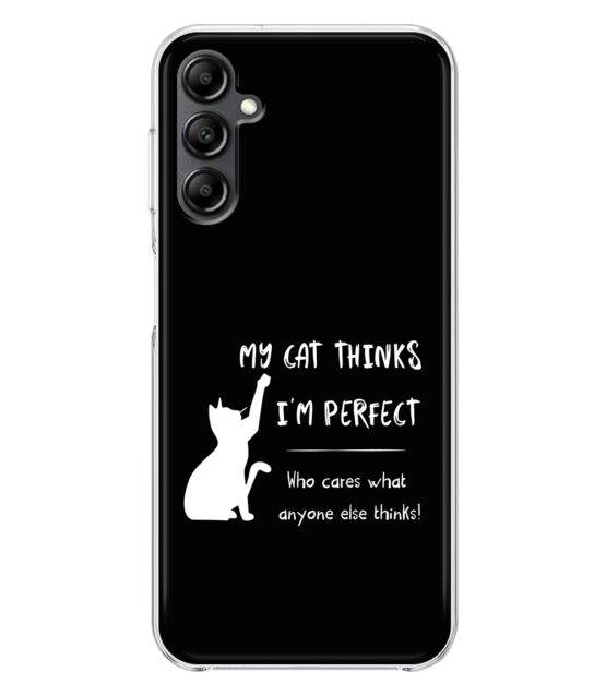 Capa de telemóvel em silicone para Samsung A14 (4G / 5G) com a frase My cat thinks I’m perfect, who cares what anyone else thinks!