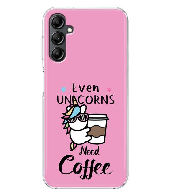 Capa de telemóvel em silicone para Samsung A14 (4G / 5G) “Even unicorns need coffee” de um unicórnio com café.