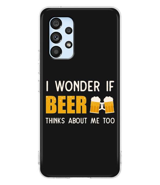 Capa de telemóvel em silicone para Samsung A53 5G com a frase I wonder if beer thinks about me too, ideal para quem adora uma boa cerveja