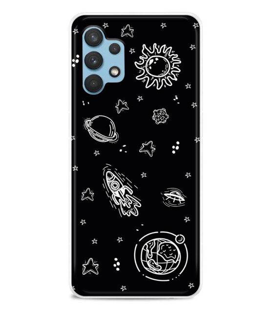 Capa de telemóvel em silicone para Samsung A32 4G com fundo preto e ilustrações de planetas e foguetões, é transparente nas laterais.