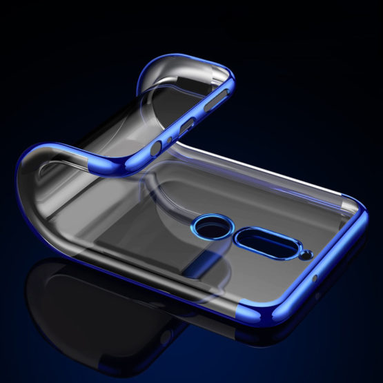 Elegante capa totalmente em silicone sendo a maior parte transparente e colorida nas laterais.