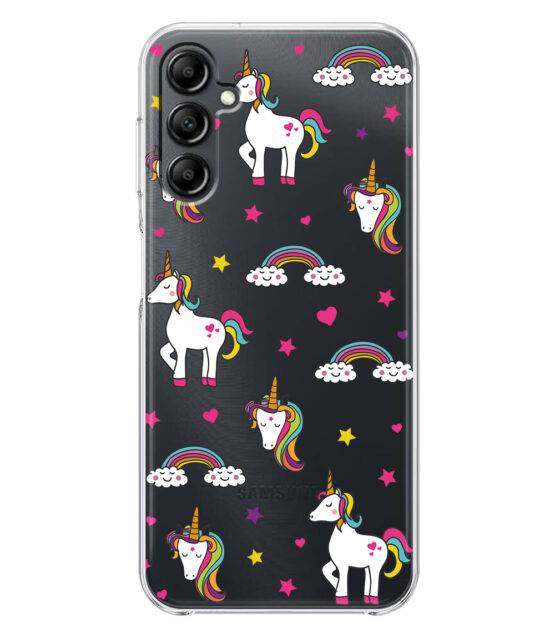 Capa de telemóvel em silicone para Samsung A14 (4G / 5G) com fundo transparente e unicórnios coloridos.