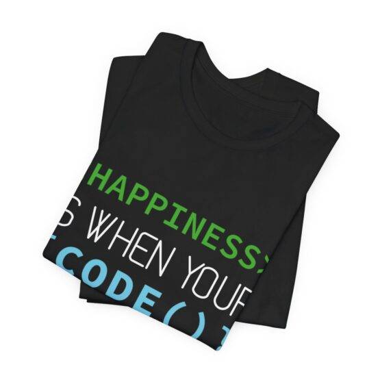 T-Shirt unissexo dedicada aos programadores e com um toque de humor, com a frase “Happiness is when your code runs without error”. Feita de malha Jersey de 100% de algodão macio e com uma estampagem de qualidade.