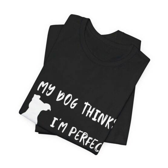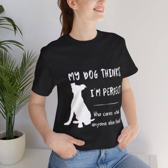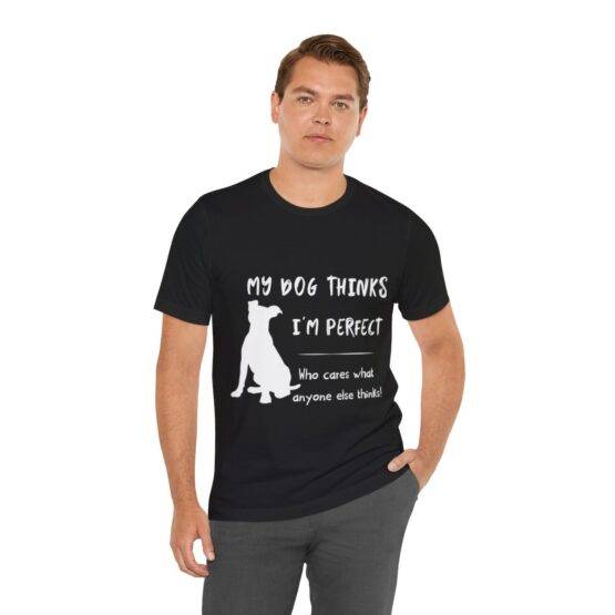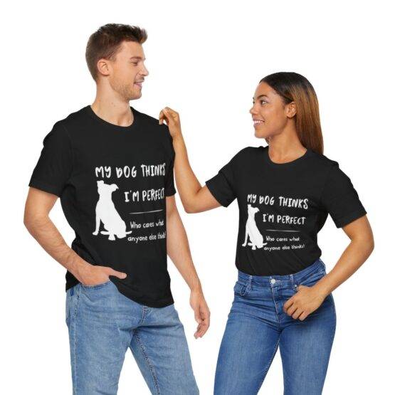 T-Shirt unissexo com um toque de humor para quem adora os nossos amigos de quatro patas, com a frase “My dog thinks I’m perfect, who cares what anyone else thinks!”. Feita de malha Jersey de 100% de algodão macio e com uma estampagem de qualidade.