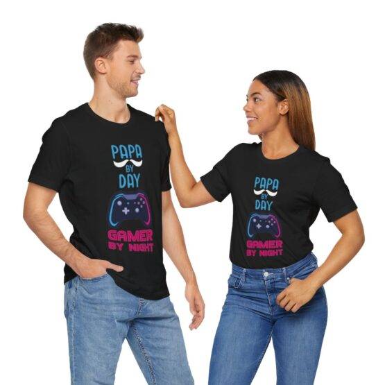 T-Shirt unissexo dedicada aos Gamers e com um toque de humor, com a frase “Papa by day Gamer by night”. Feita de malha Jersey de 100% de algodão macio e com uma estampagem de qualidade.